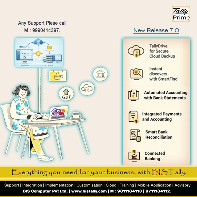 #BISTally |Watch the full video - https://youtu.be/kjUaIAVpaEY to discover how the new Tally Prime 7.0 can significantly improve your business! | Tally Partner - provides free support and advice for your growing business using Tally Prime, the best ERP software available. We offer excellent utility and connected services, enhanced with advanced artificial intelligence features. For the best explanations and guidance, feel free to contact us at Tally Partner. We're here to support you! Cloud-Based Browser Reporting Worksheet Compatible Dashboard & Customized Report Barcode & Pos WhatsApp & Meta-Compatibility Manufacturing With Job Work Process Trading & Sales Process Quotation To Invoicing with GST Return Distribution System Auto Banking & Capital Management Call us for any thought process about the ERP and know how to do it in Tally Prime. M: 9990414397 | BISTally The best tally partner – BISTally with a 100% Customer happiness index. More Info : https://www.bistally.com/latest-update/gold-up-offer-single-to-multi-user-upgarde-best-25-limited-time-offer-tallypartner/115